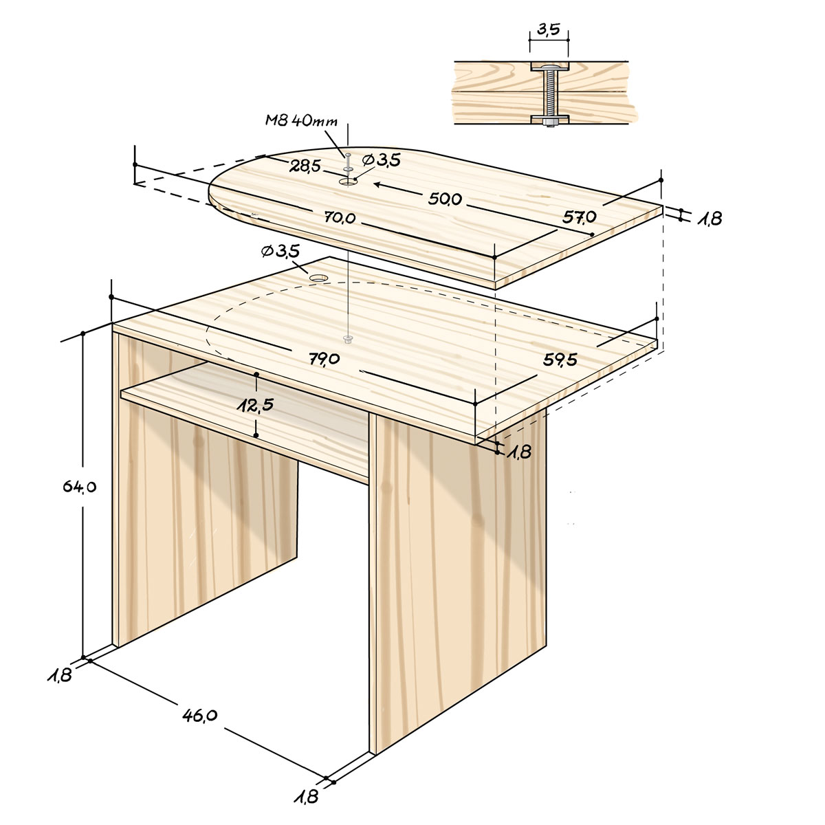 Wir haben als Basis den Kiefernholzschrank "Fjell" von Ikea benutzt. Der besondere Clou ist der schwenkbare Tisch, der so auf einfache Weise für ausreichend Beinfreiheit und Abstand zum Bildschirm sorgt.